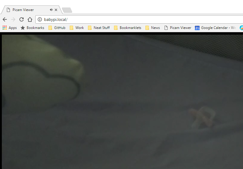 Originally I had planned to use the Pi NoIR camera module because it can see infrared light. However, since infrared light is still light (just not visible) I didn't really want to take a chance of accidentally "shining" it straight onto my son's face. There is no real evidence to suggest that infrared baby monitors are dangerous to infants--but concentrated IR is still not good to have directed at you. The fact is that nightvision baby monitors probably use a very low light level and it's probably not dangerous at all.