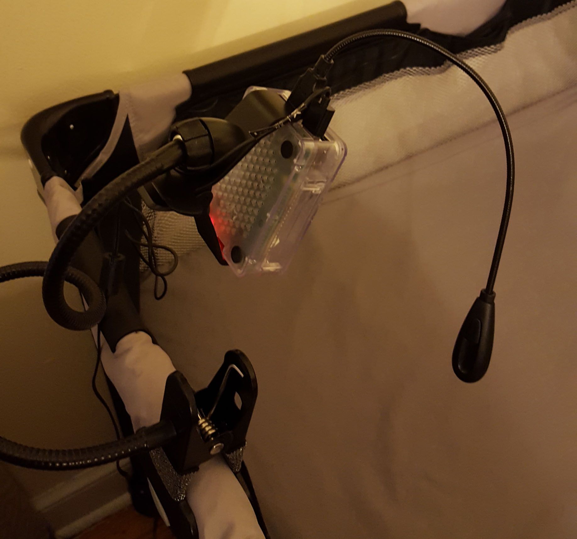Now that we've configured the baby Pi, we need to put it near the baby! As I mentioned at the start, I am just using a simple LED light to help when its dark. With a gooseneck mount, we can also position the monitor in whatever way we need that provides the best view of the crib. What's nice is that you can fit everything you need onto a single Pi, so it can travel with you.