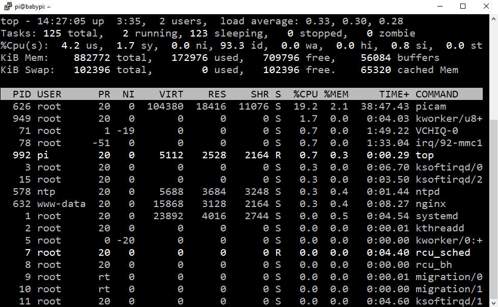Once the Pi is booted, type top to see running processes. You should see Picam at the top.