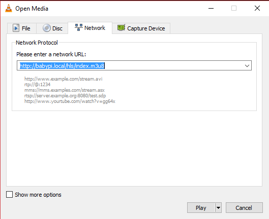 In the first part where you configured the Pi, you choose a hostname (or didn't). You can now access the stream URL at http://babypi.local/hls/index.m3u8. You can open that up in any compatible software to view the livestream.
