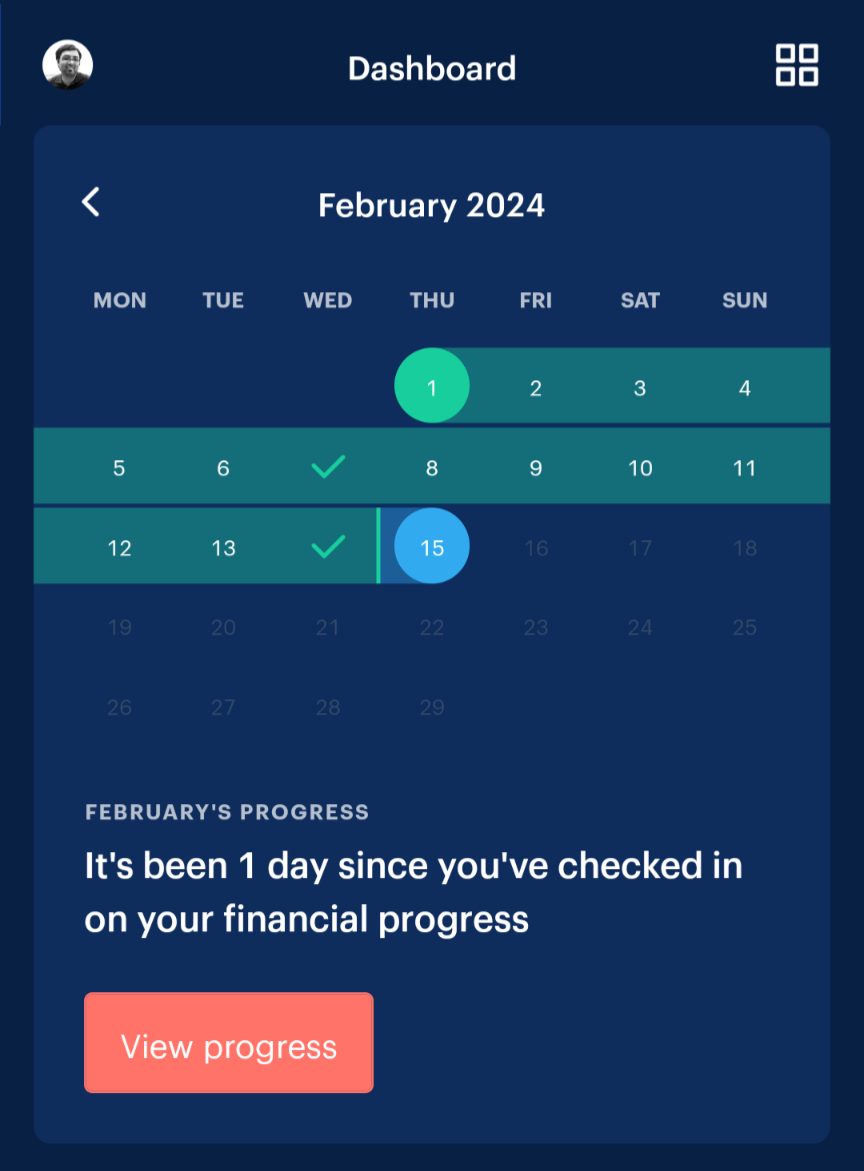 Quick progress check-ins. Anytime you open the app, it provides a calendar at the top where it highlights the days since you last reviewed your finances. You tap "Start Review" and it walks through your key vitals step by step – cash in/out, net worth increase, debt breakdown, etc. It makes checking in much easier. This is not a feature in the web-based app, I've only seen it in the mobile app but that makes sense – on my phone, I'm mostly interested in quick check-ins but the app is also fully-featured.