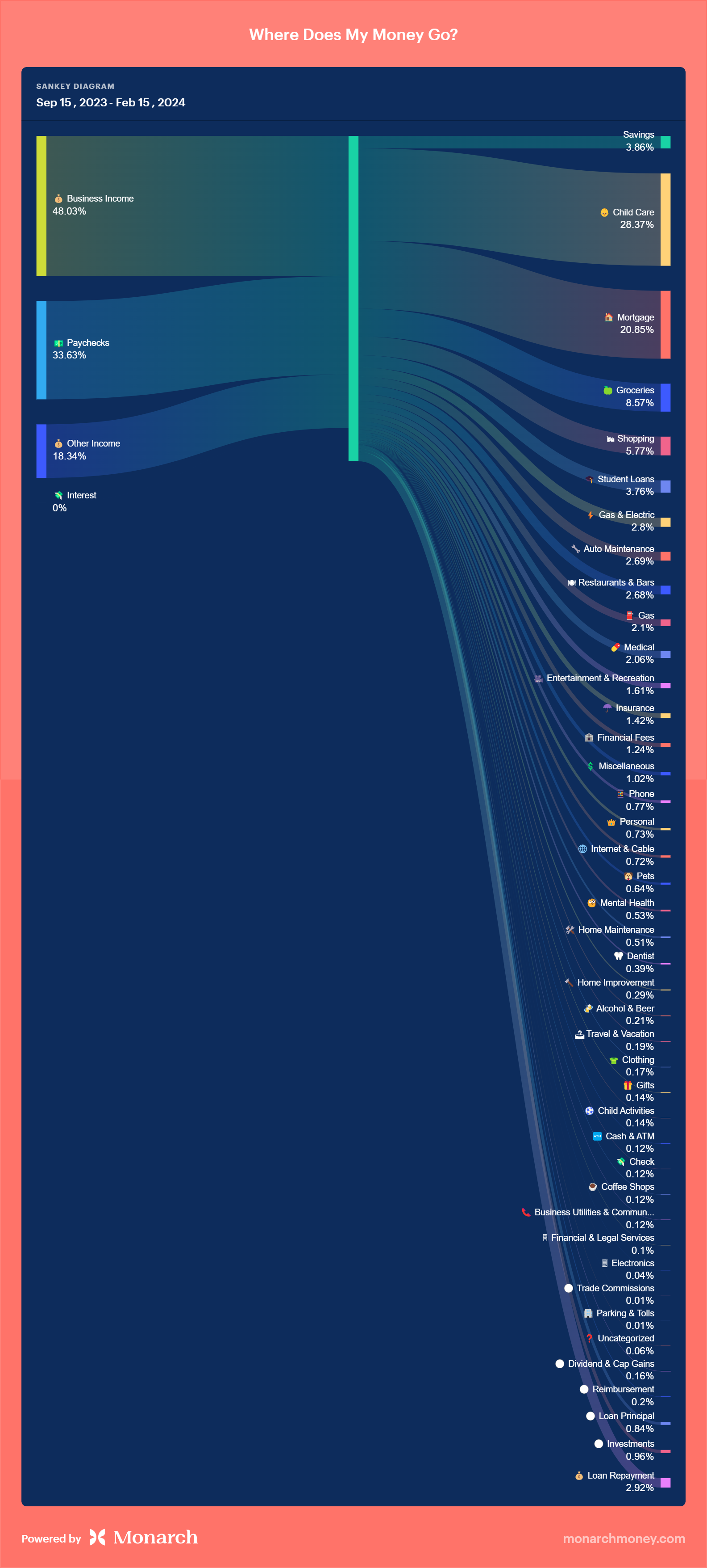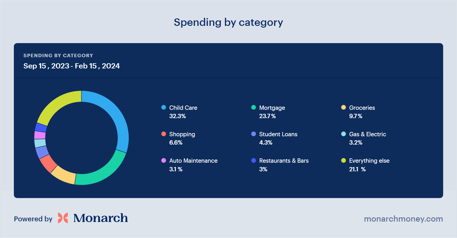 Lots of reports. As featured above, Monarch is continually adding new ways to visualize and get insights into your spending. The Sankey diagram is awesome and for most visualizations, you can share them without numbers (so you can see how kids are more expensive than our house).