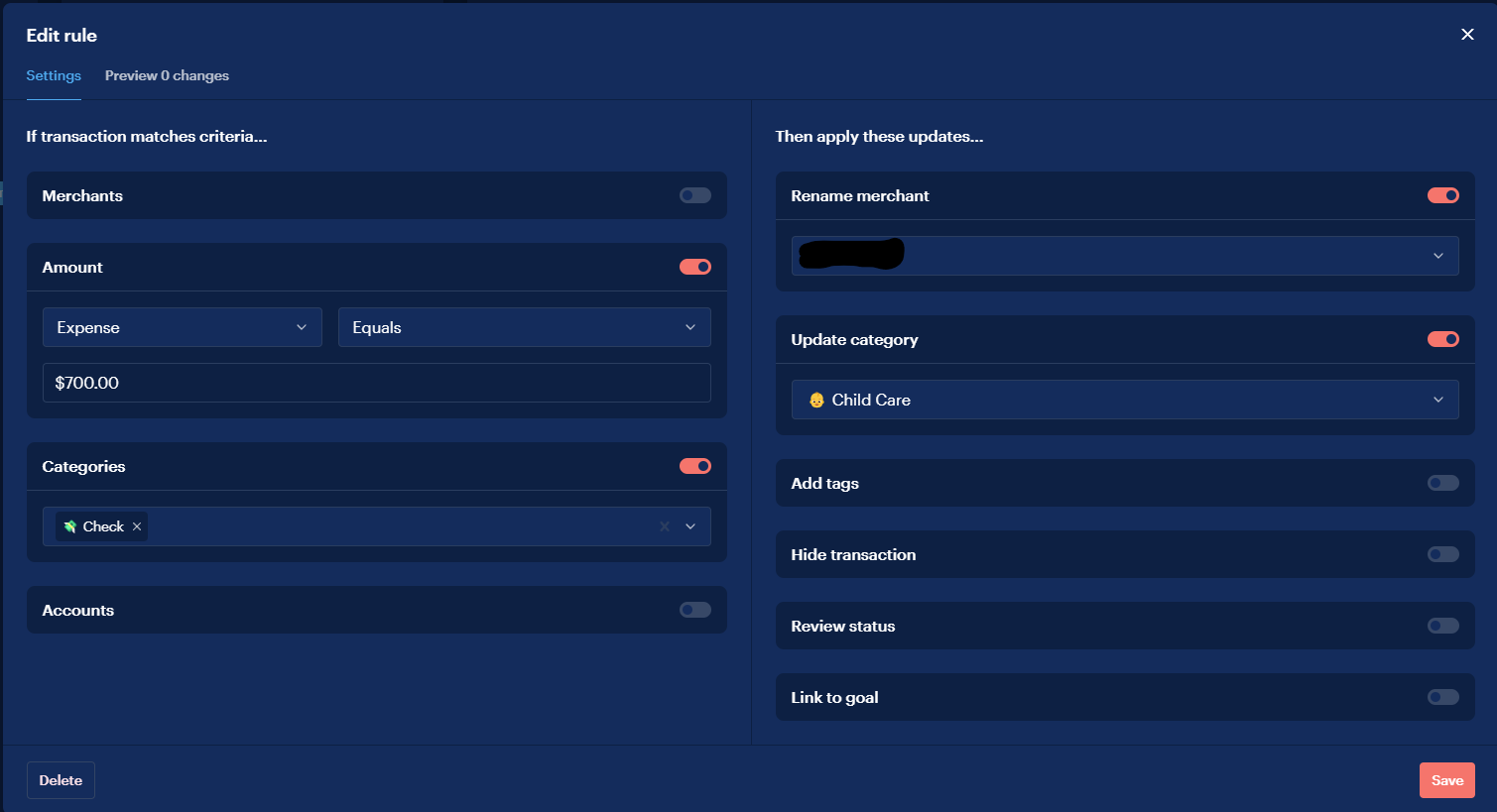 Advanced rule engine. Mint had custom categories but Monarch goes a step farther, allowing you to dynamically match transactions. It was always annoying in Mint how I always had to manually categorize daycare expenses because it just says "CHECK" yet the amounts always were the same. With Monarch, I set up a rule to do it 🎉