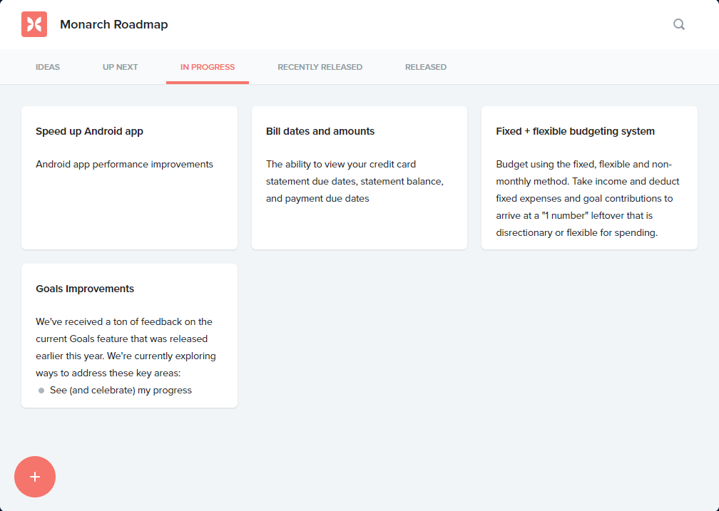 Public roadmap. The Monarch team is pretty transparent in what's coming and you can see the work as it progresses. This is a great way to have your say in what gets built.