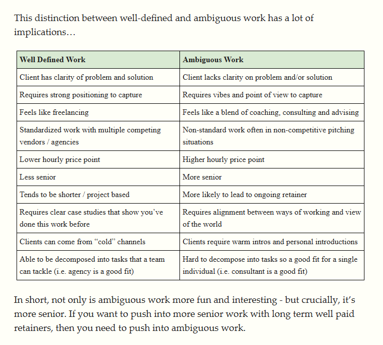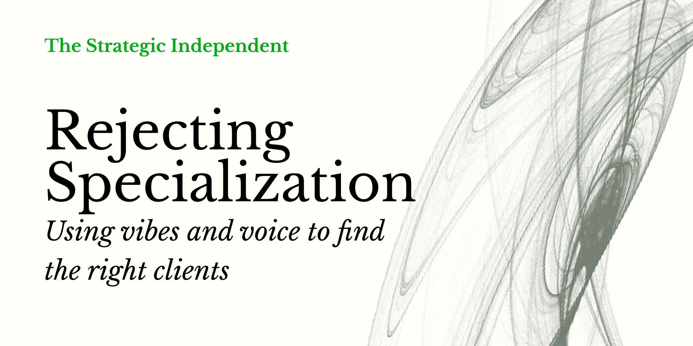 Many independent consultants are independent for a reason - we’re contrarian, we’re attracted to a myriad, varied array of work. We chase novelty and surprise - we’re often seeking an alternative path. And specialization doesn’t lend itself well to novelty and surprise.