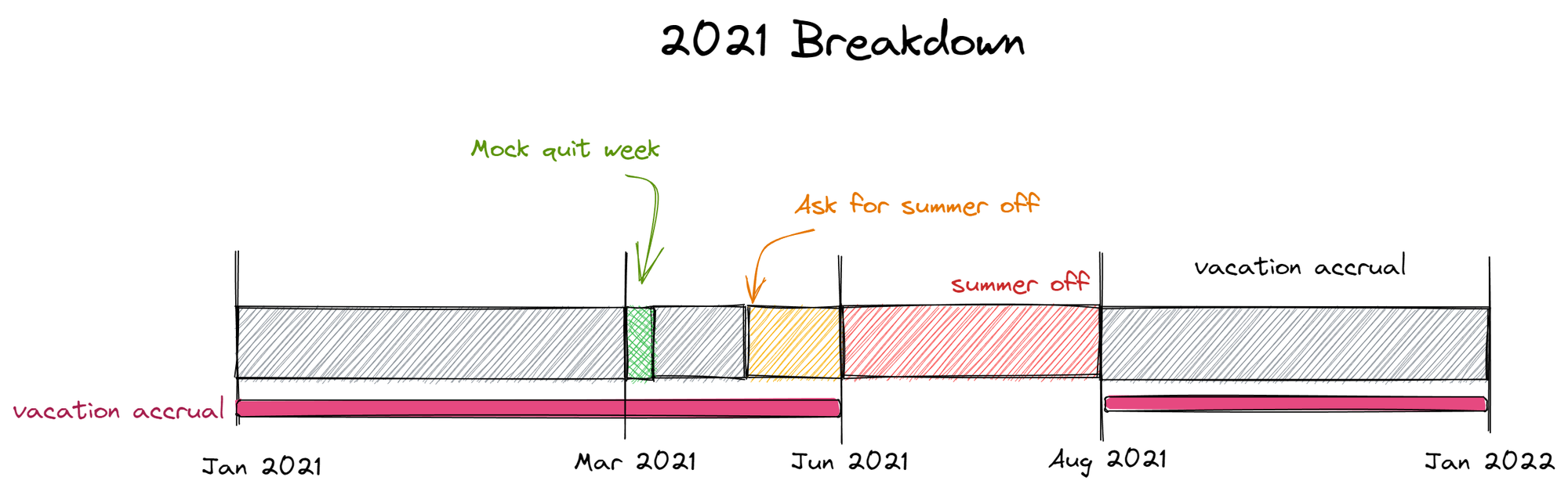 In 2021, I had planned to take the summer off from Jun-Aug, so I planned a mock quit week for March – 3 months before. I took into account vacation accrual and having a one-month buffer before I requested the summer off in April.