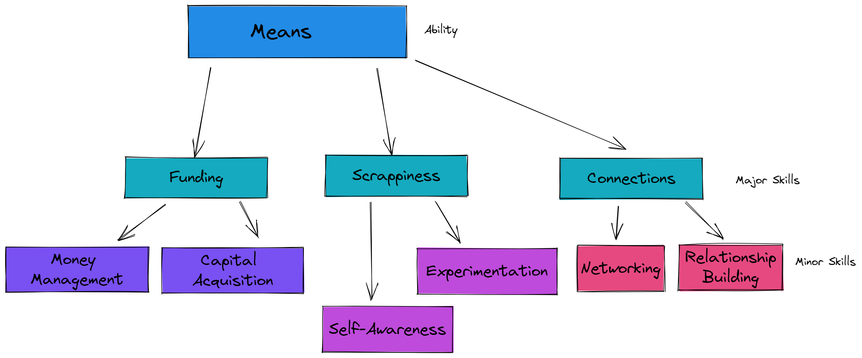 The Major skills for Means I originally proposed was Personal Finance and Creativity. I'm going to tweak these slightly to Funding and Scrappiness. The other one someone pointed out that I was searching for the right word for was Connections.
