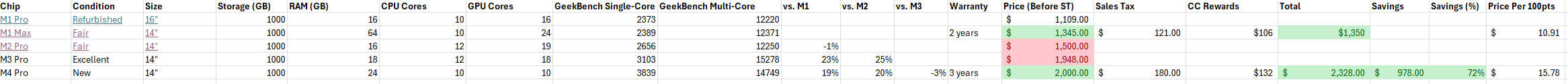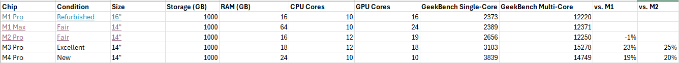 Sometimes you'll be surprised by the results, like that the difference between a previous-gen M3 Pro and the current M4 Pro is really low. To me, it made no sense to buy a refurb M3 MacBook when I could buy a brand new one factory-sealed for essentially the same price (and with more RAM). That took the M3 out of the running for me.