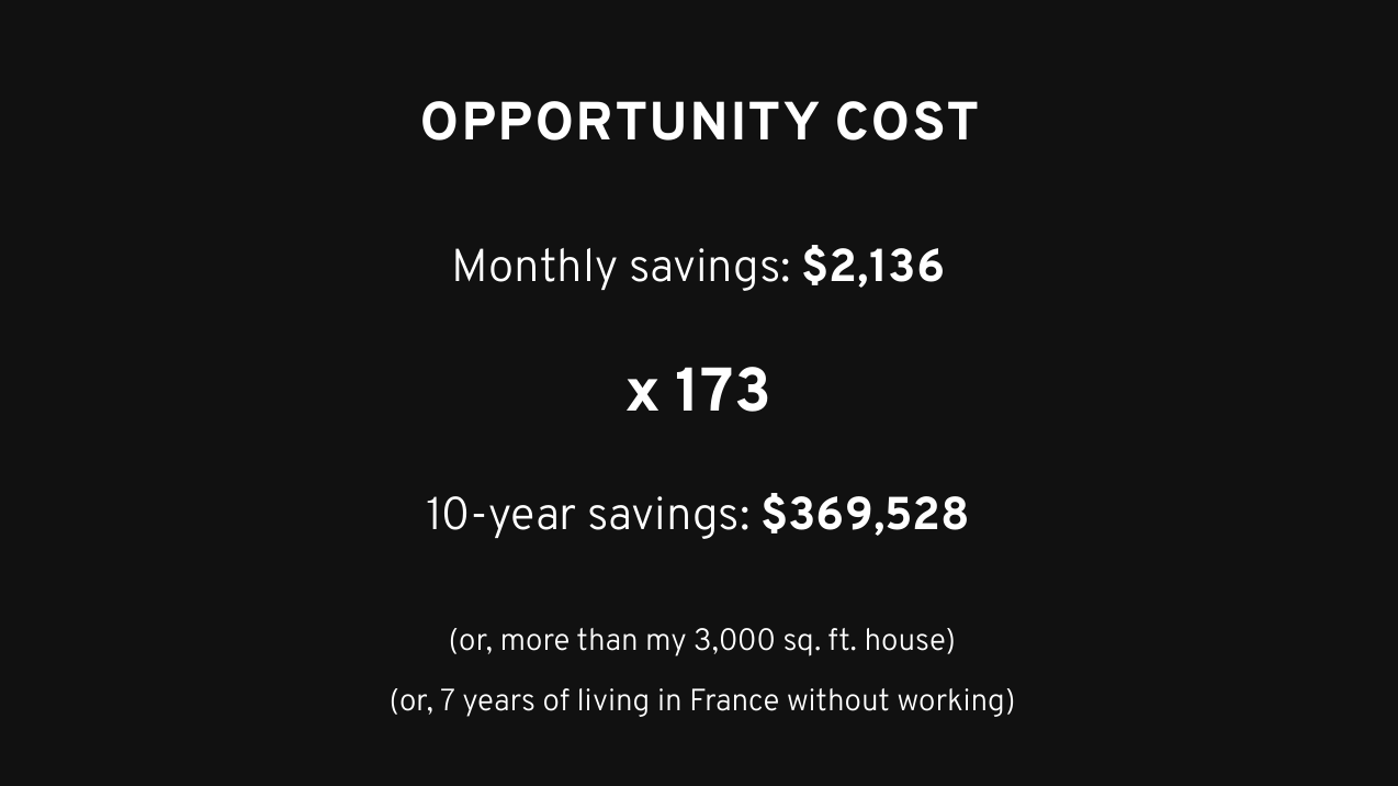 I share this slide in my talk because after getting intentional, it made a massive impact on my finances – leading to hundreds of thousands of dollars saved in the long-term: